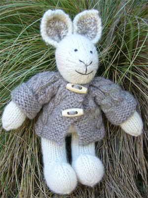 Bramble Bunny looks warm and cozy in his cable jacket. This wee fellow is knitted in an alpaca blend yarn giving him a slightly fuzzy and gloriously soft feel, however other standard 8 ply yarns will look just as cute. 24cm tall. Bramble's pattern uses DK / 8ply yarn and 3mm needles throughout.