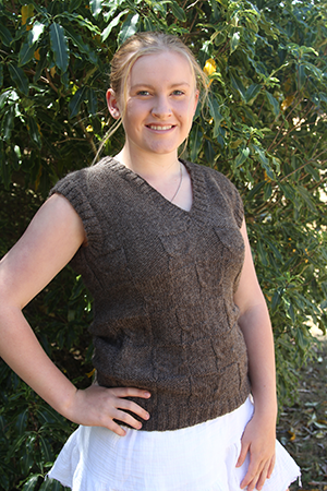 Our V Necked Vest is a cabled vest using 10 ply yarn, and can be knitted with a scoop neck option.