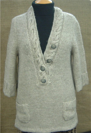 Our Caroline Jumper was designed by Caroline Gardner. A jumper with a lowline cabled v-neck, three quarter sleeves and pockets.