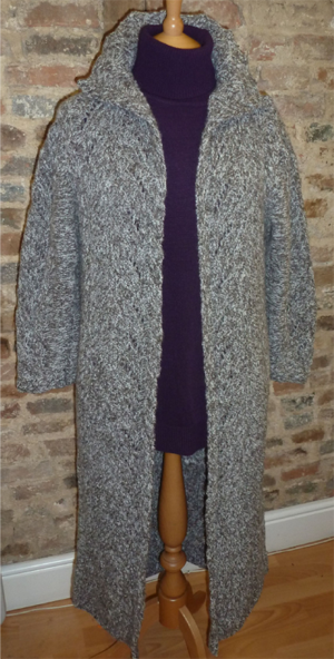 Our Adele Full Length Cardigan, designed by Chris Dilly, is an adaptation of a delicate 'tree of life' pattern. The entire garment is very light weight, knitted in BlackHills novelty crinkle yarn.