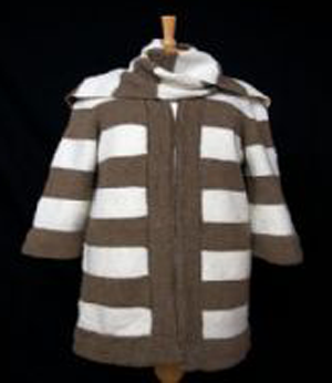 Our Lorraine Coatigan is a ¾ length coat with a scarf attached. The sample in the photograph is knitted in BlackHills natural coloured dye free 100% wool in Ivory and Cinnamon. This pattern is for an intermediate knitter and comes in sizes 96½cm (38") - 107cm (42")