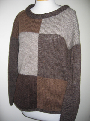 Our Laurie Jumper is a simple colour block garment using four colours of yarn, with a loose garter stitch neckline.