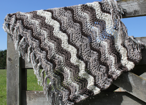 The BlackHills Southern Alps Throw is a gorgeous throw made up with 6 different BlackHills yarns. Crinkle, Stone, Ebony, Ivory, Slate and Silver, a mix of 14 ply and 10 ply. Knitted in blocks of the pattern to create a 'wave' effect.